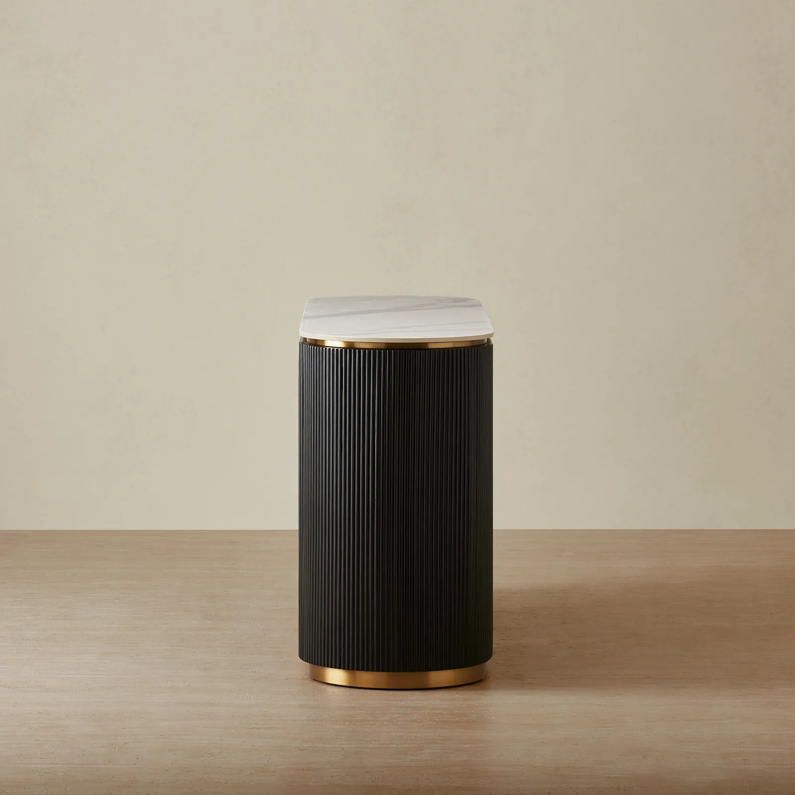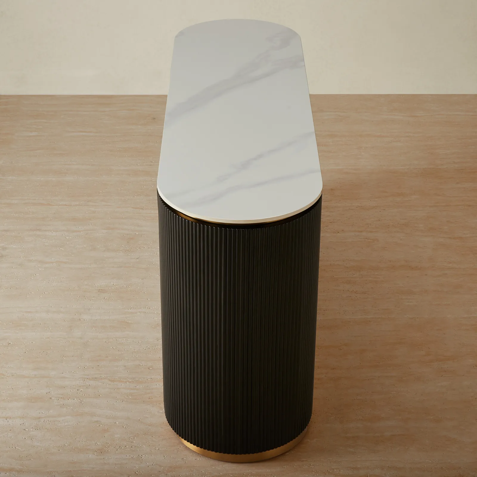 The Archie Sideboard marries durability with high design, featuring a resilient white sintered stone top. This pristine surface is supported by sleek black stainless-steel panels, grounded with a luxe golden base.