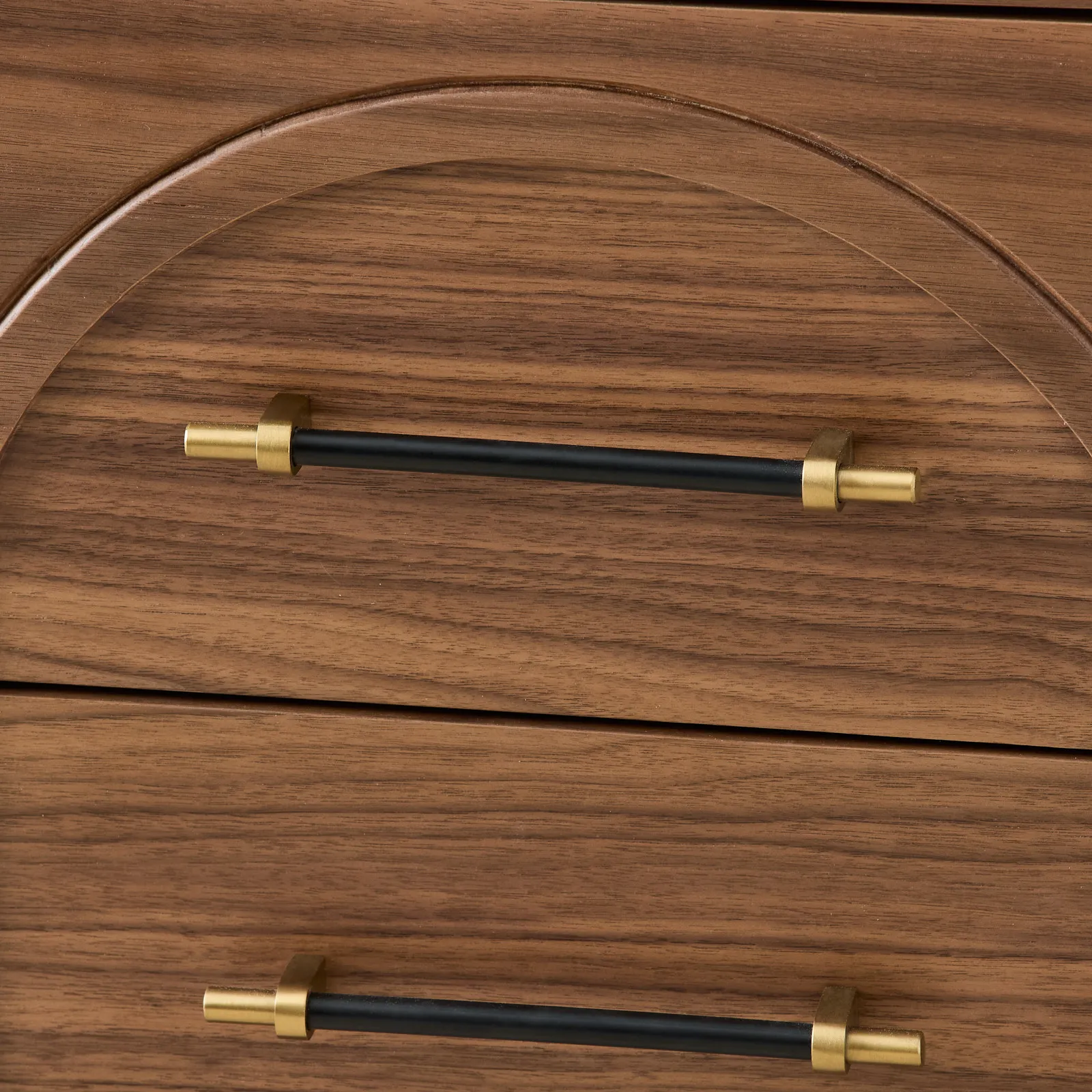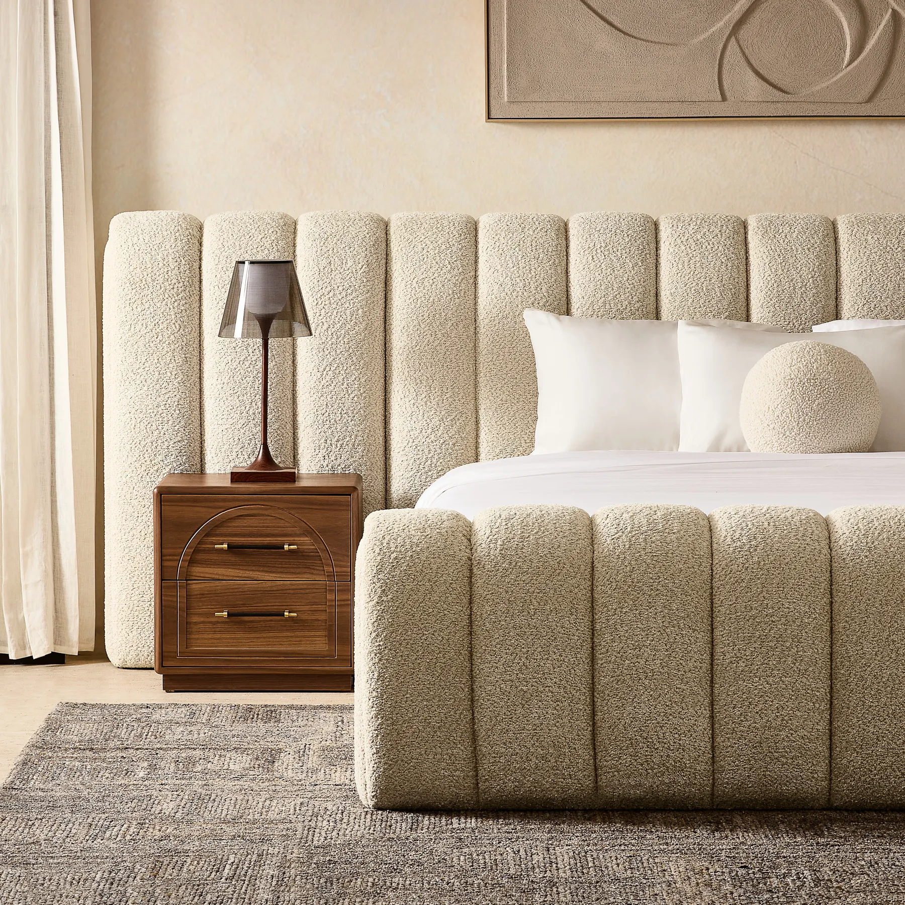The Costanza Bedside Table is draped in mocha walnut veneer that brings warmth. Its front design features a carved arch detail that adds subtle depth and character.