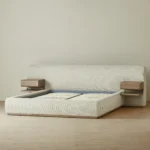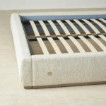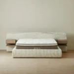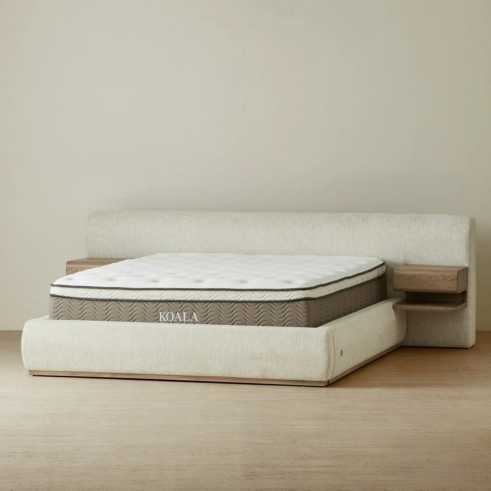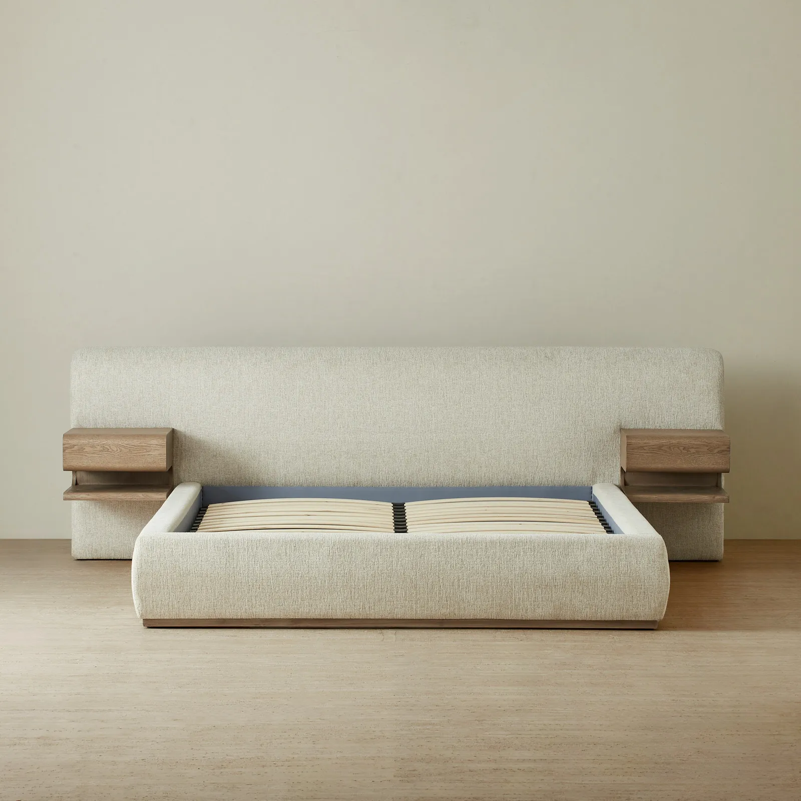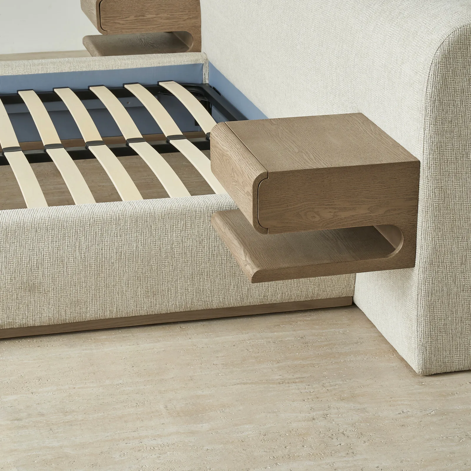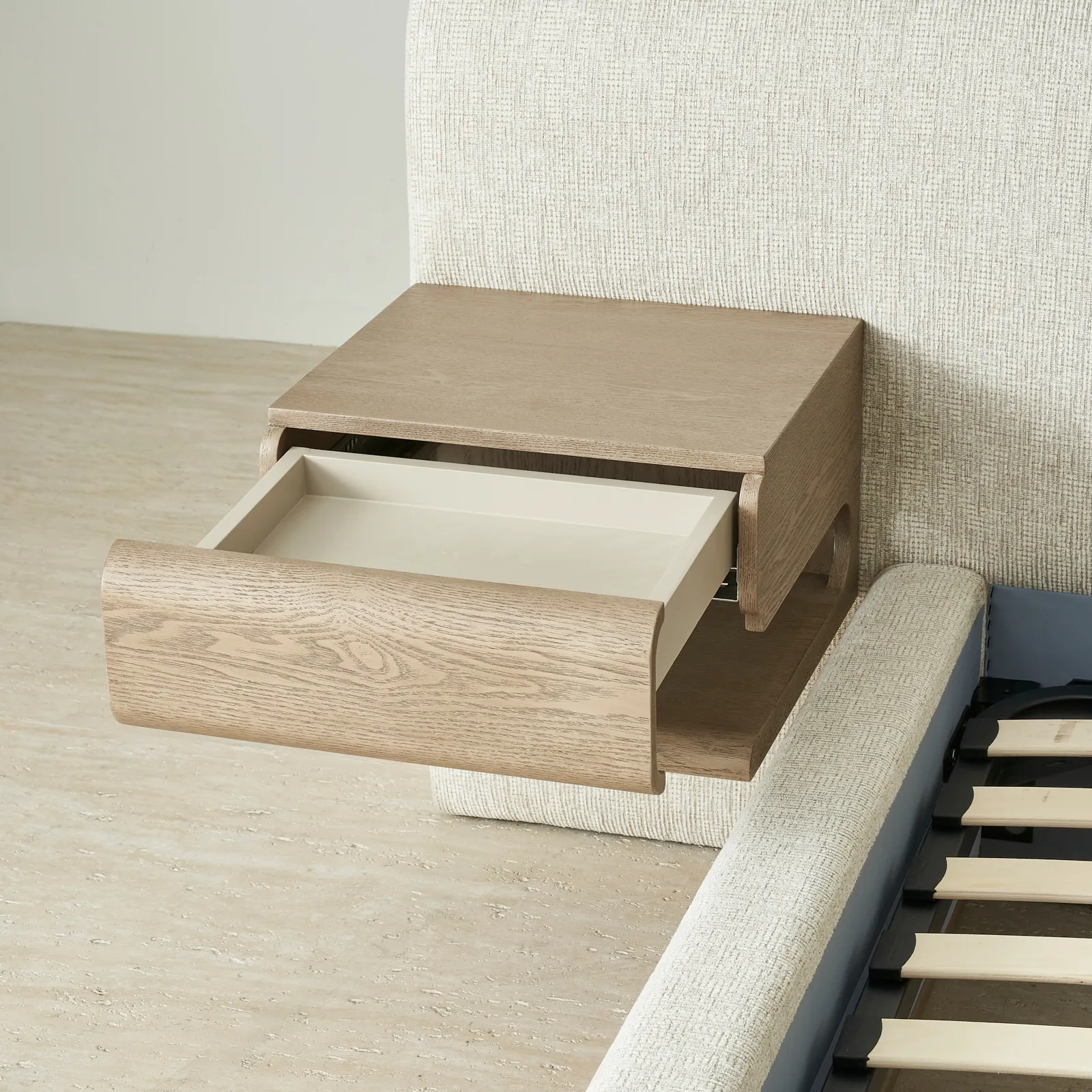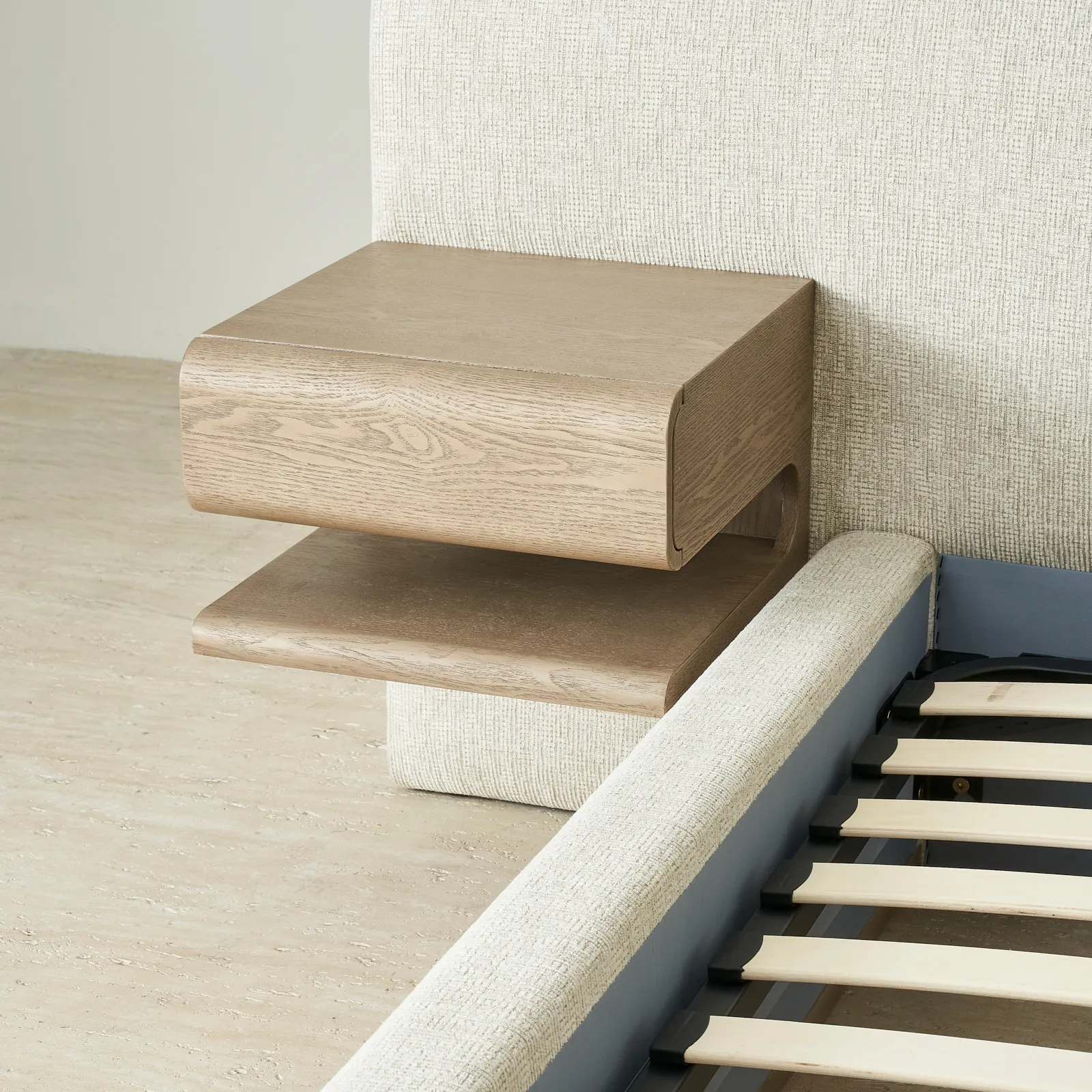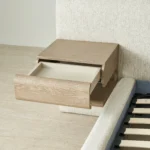 On either side of the plush headboard, two floating wooden drawers extend outward, neatly integrated, yet offering practical storage within easy reach. This bed balances simplicity and function, creating a restful focal point for any bedroom.
